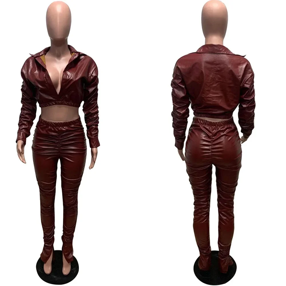 Brianna Leather Crop Top Slit Stacked Pant Set