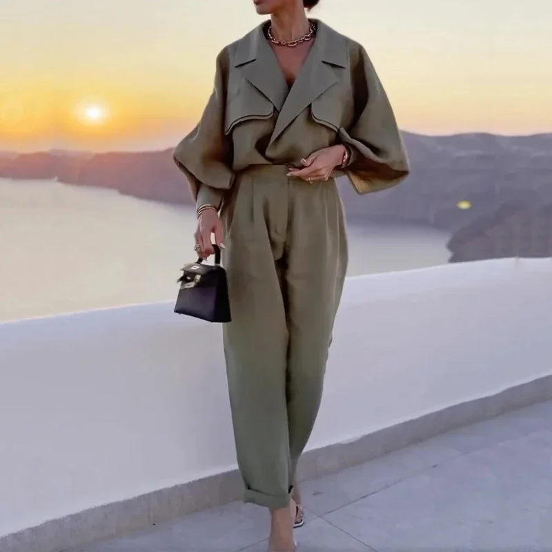 Jada Lapel V-neck Long Lantern Sleeve Pant Set